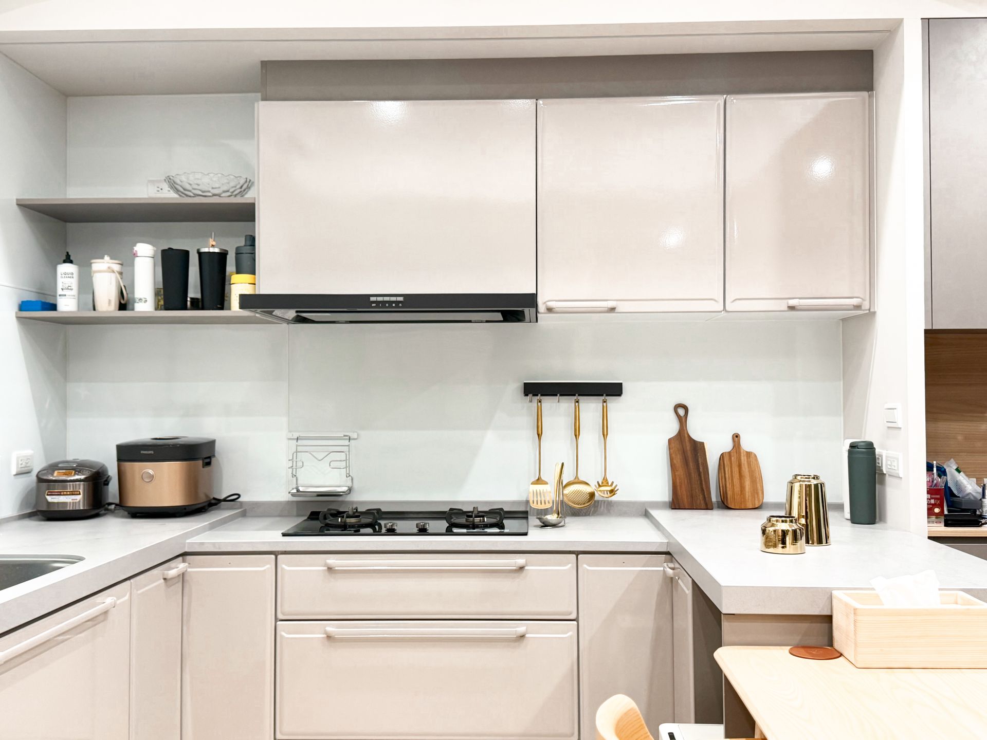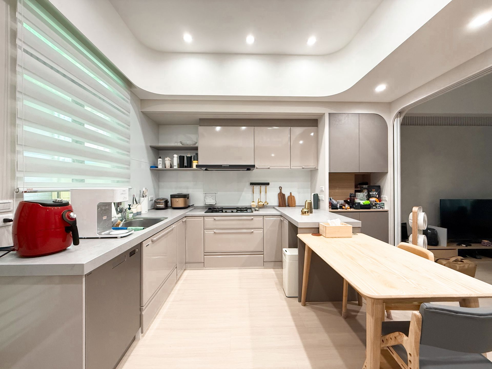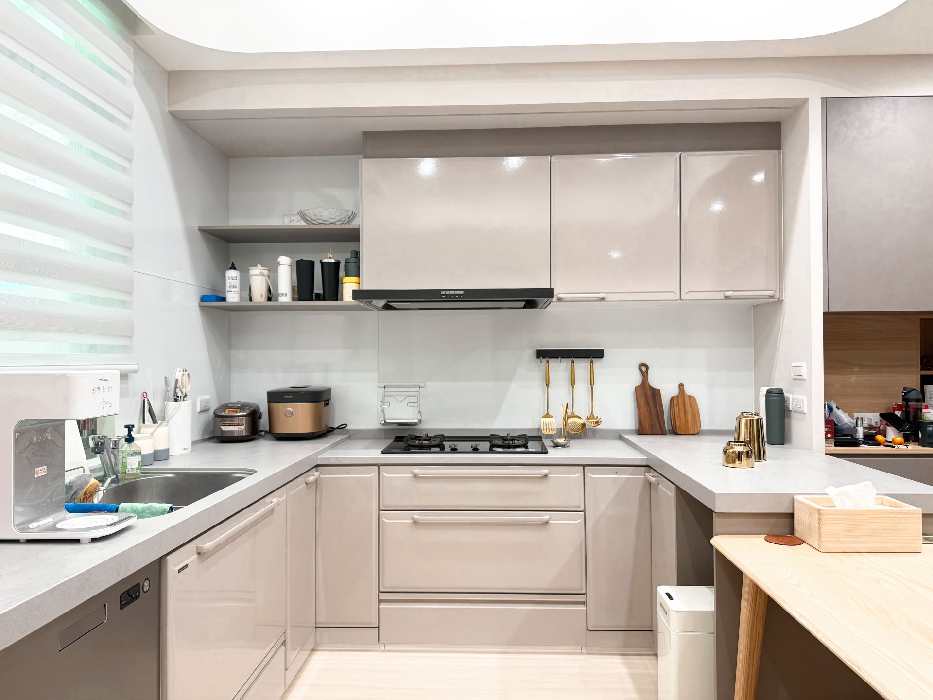 屋主在購買新成屋交屋後,邀請室內設計師規劃全室空間設計及裝修,希望廚房能兼具 美感與耐用,讓廚具與室內空間設計完美整合。