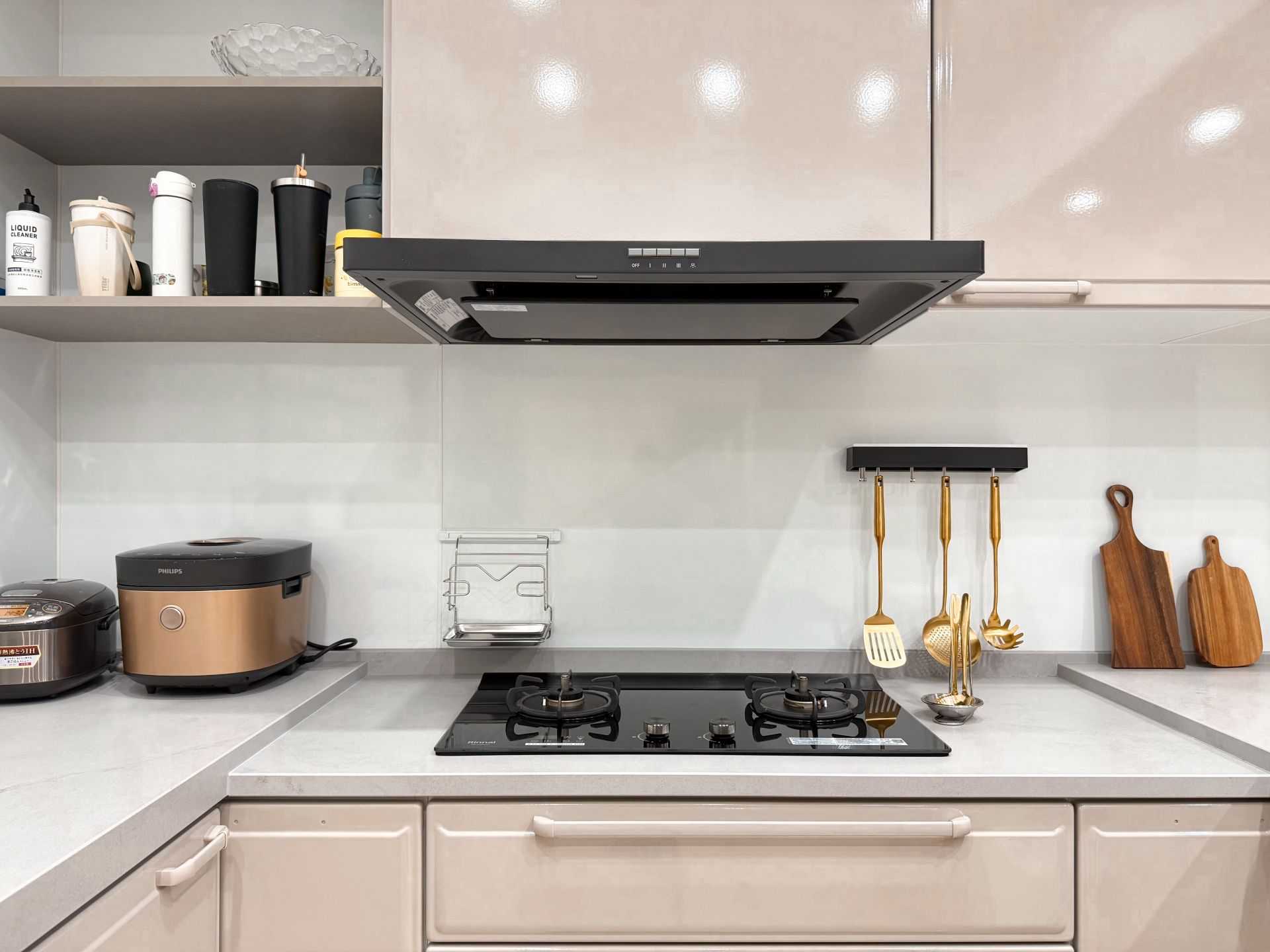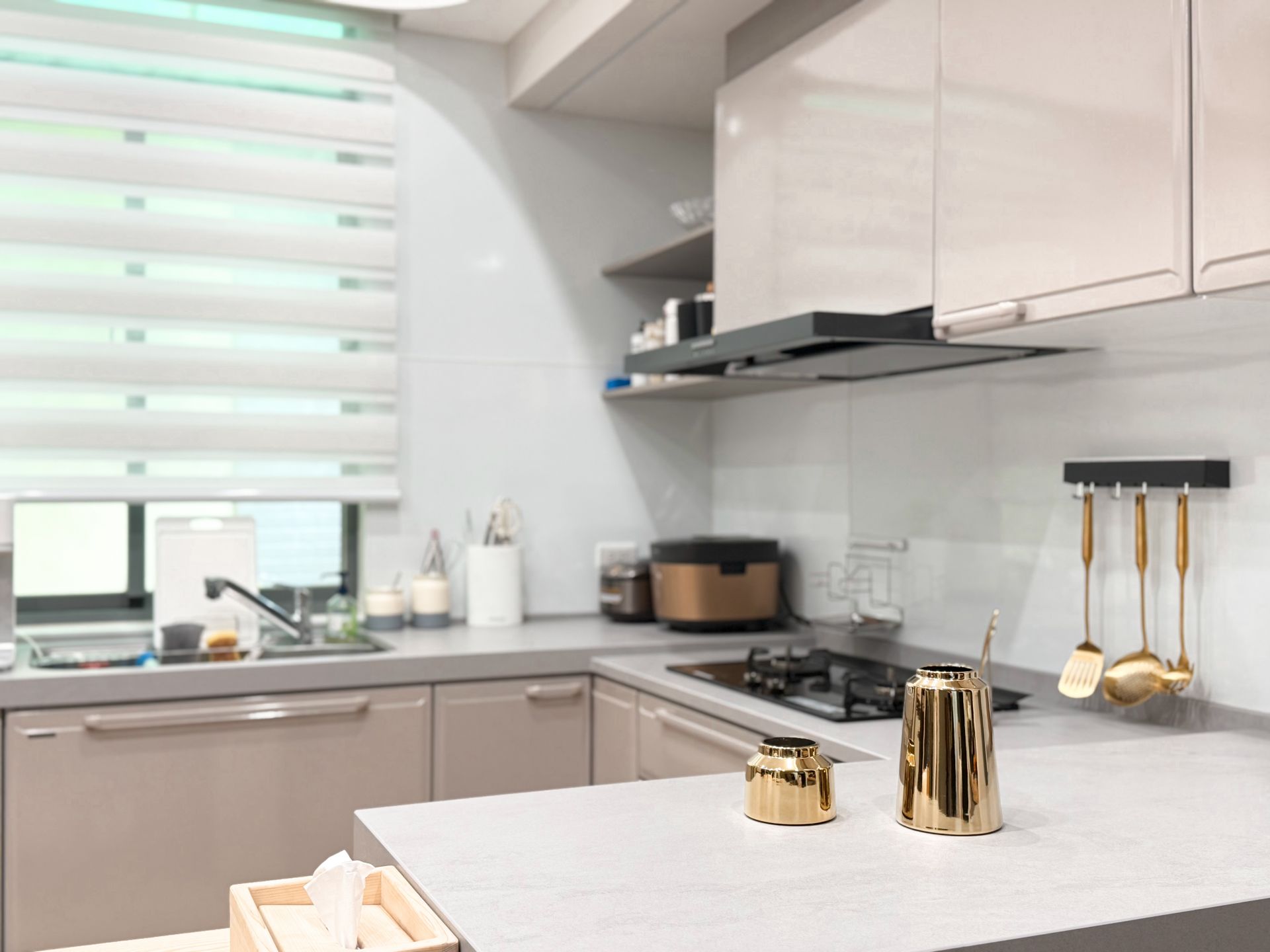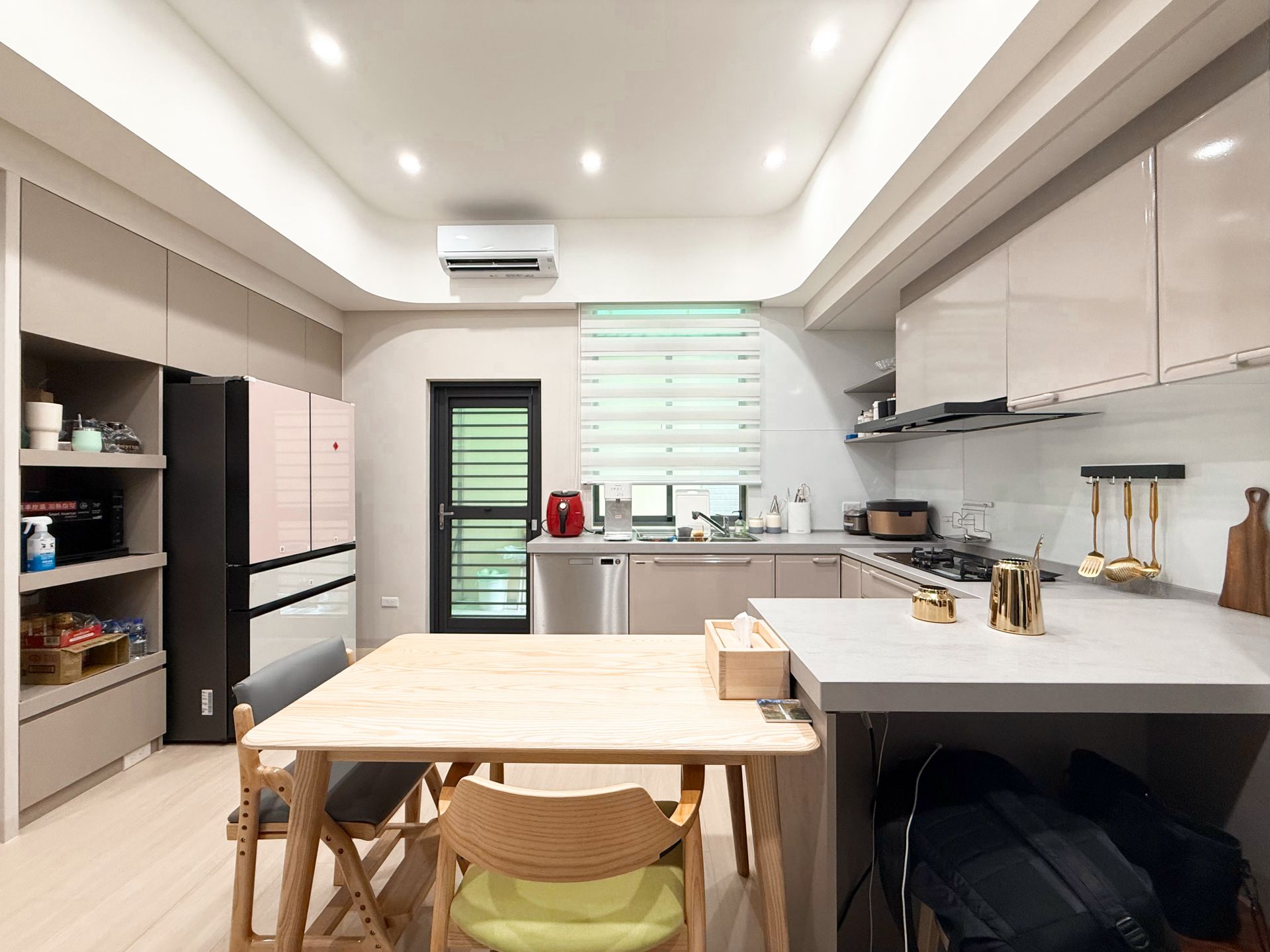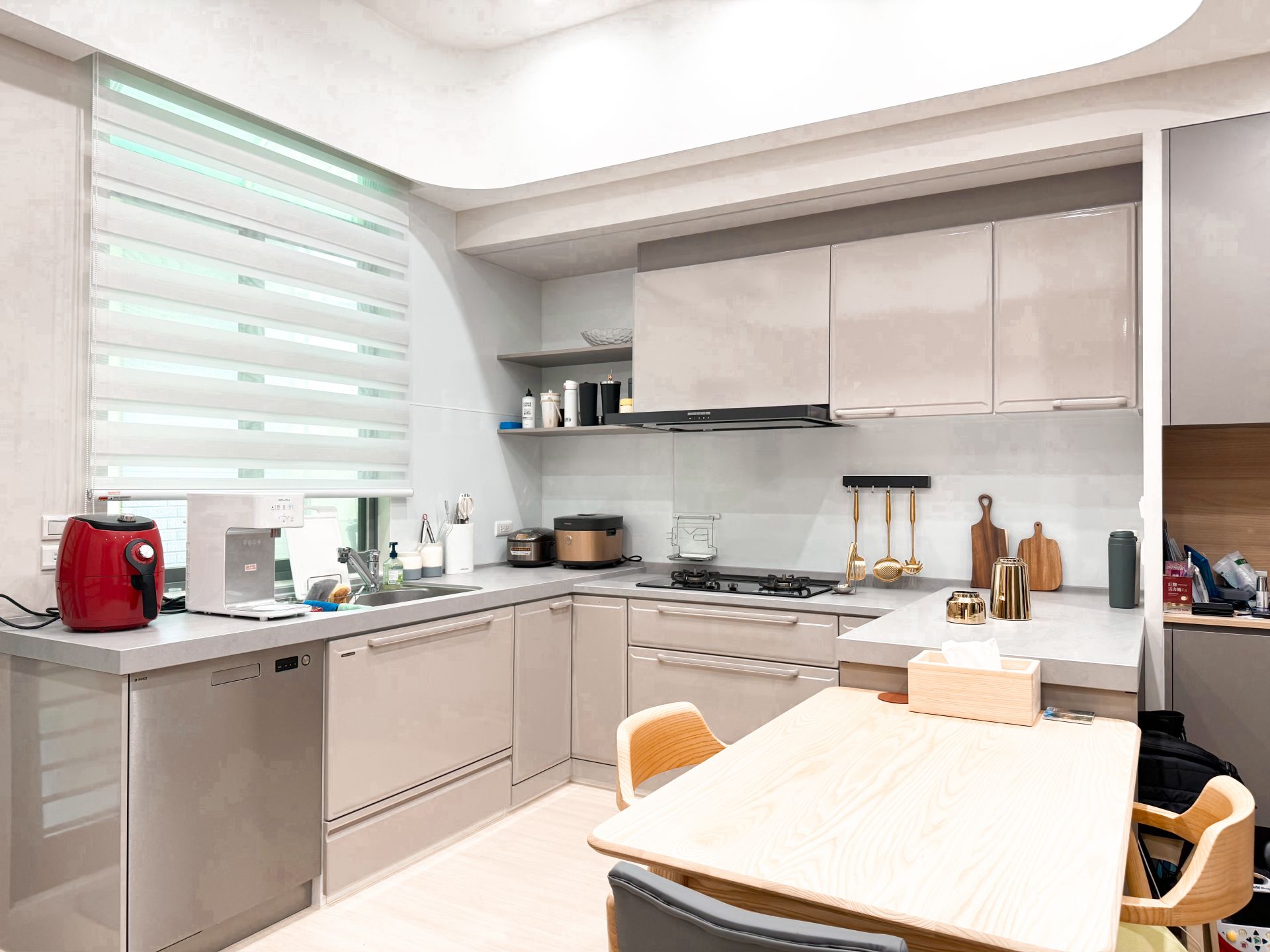 屋主在購買新成屋交屋後,邀請室內設計師規劃全室空間設計及裝修,希望廚房能兼具 美感與耐用,讓廚具與室內空間設計完美整合。