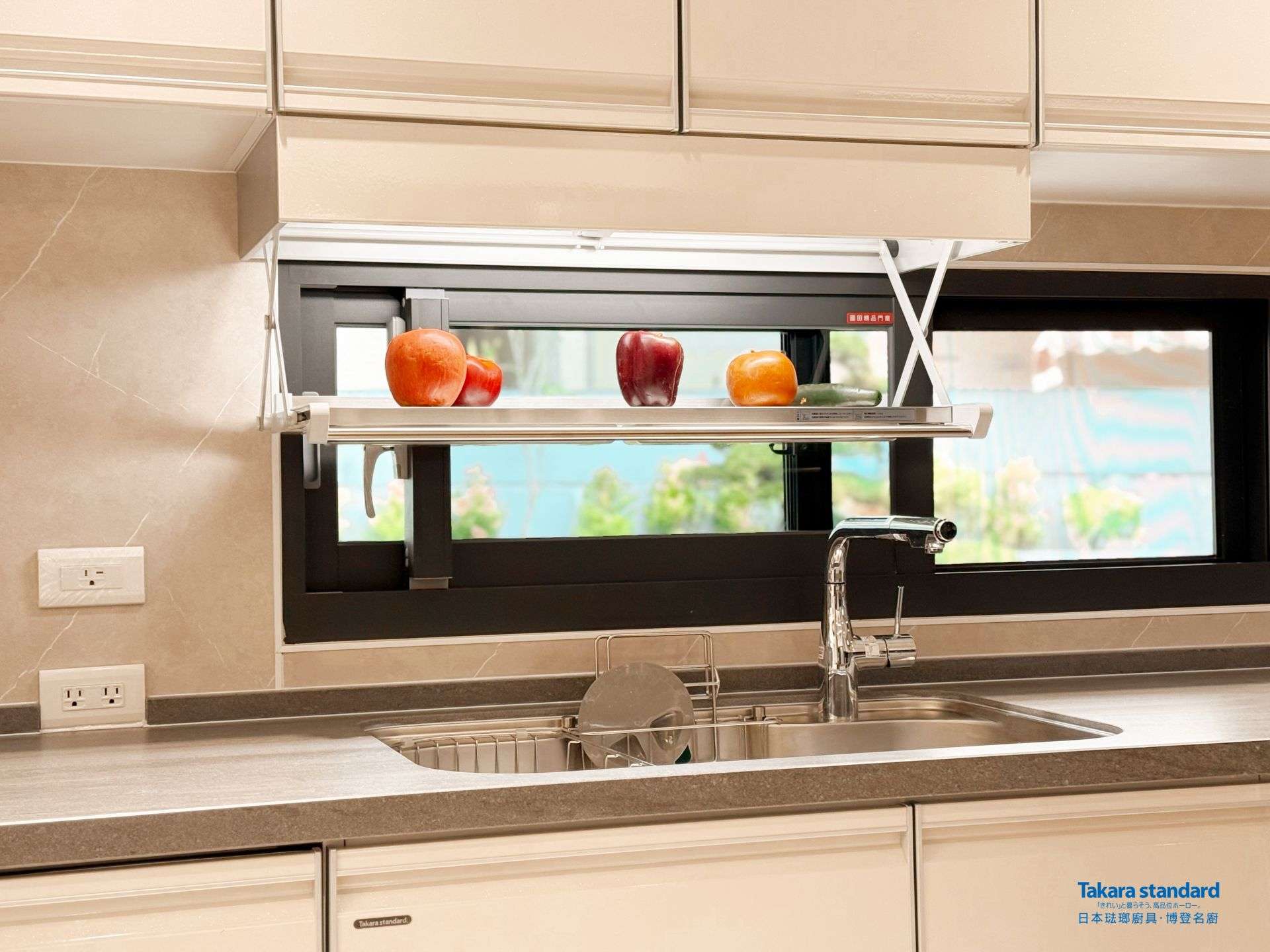 Takara 吊櫃下方可設計配置下拉式瀝水籃與下拉式收納籃,