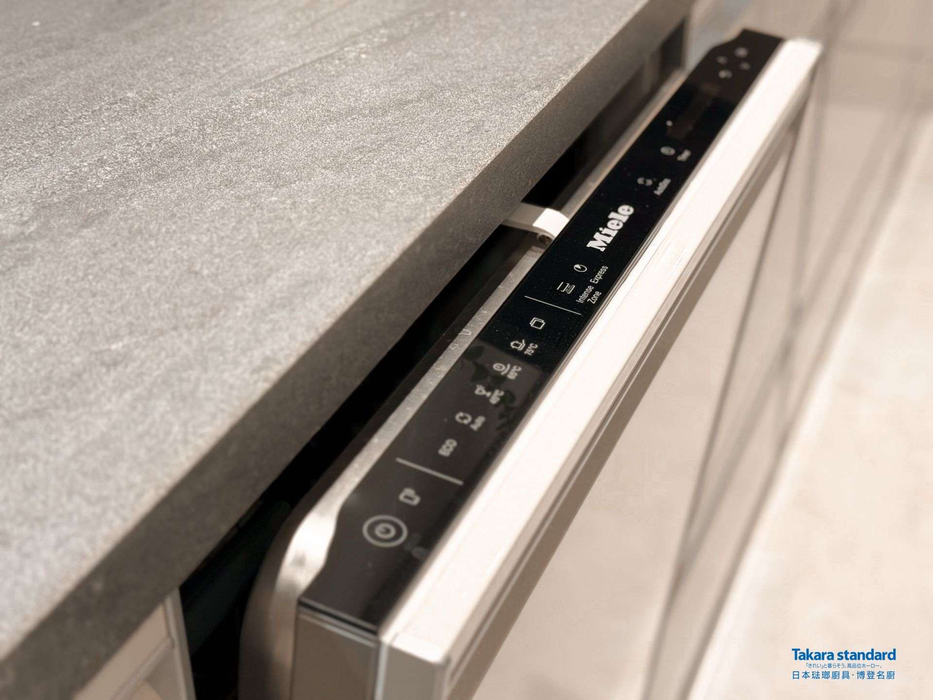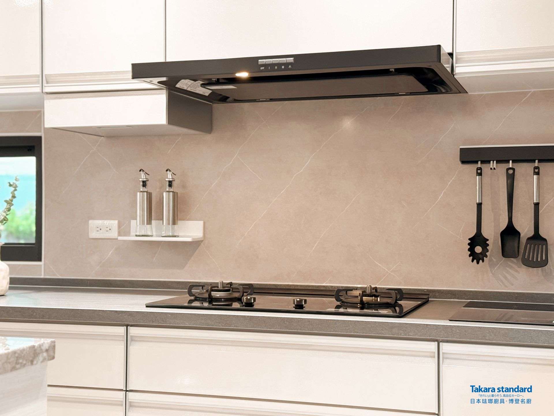 Takara 原廠琺瑯抽油煙機設計與整體廚具門板一致的琺瑯材質, 搭配內嵌式瓦斯爐與洗碗機,