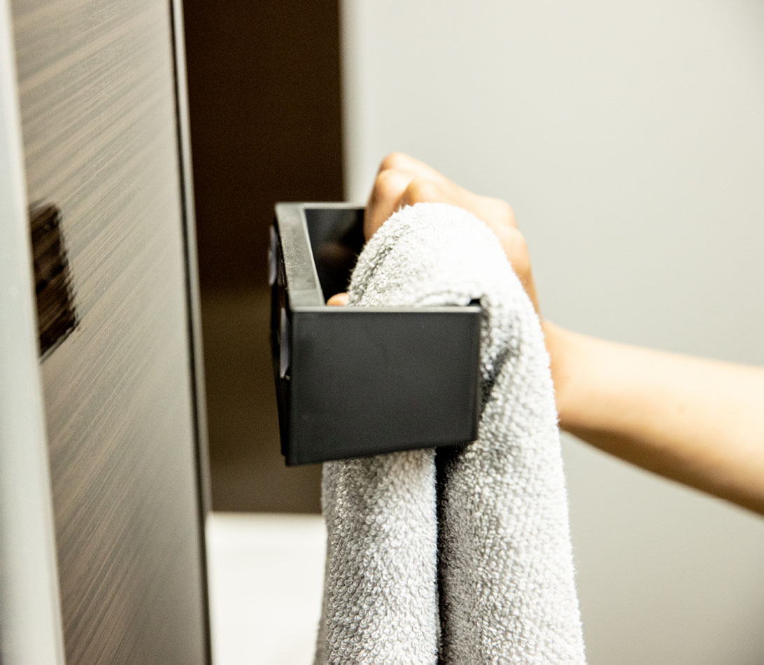 只要搭配磁吸式配件,毛巾與小物都能找到位置,不僅有效運用牆面,也讓檯面保持清爽,