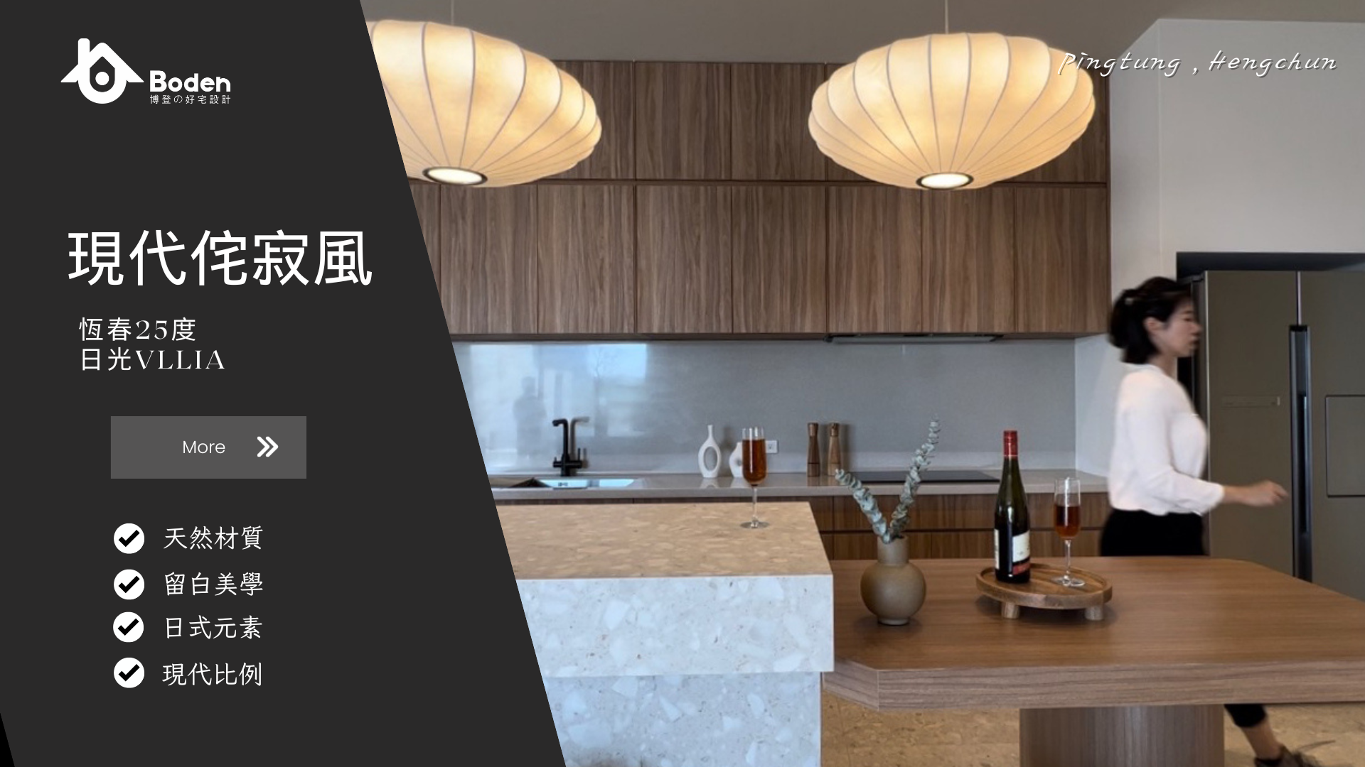 博登案例亮點: 這是博登與民宿合作的經典案例,透過石材中島與木質家具的結合,空間展現出自然純粹的質感;