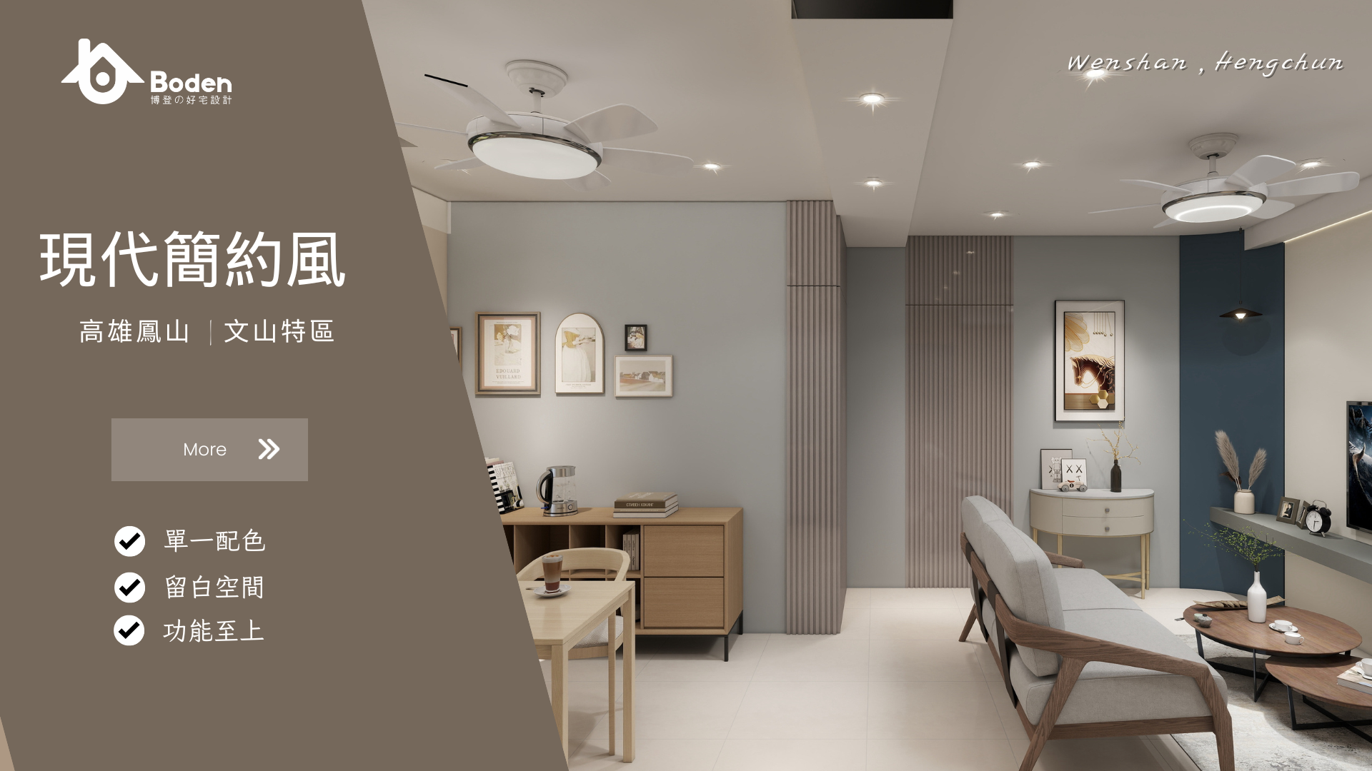 博登案例亮點: 在這個案例中,我們將現代簡約的俐落線條作為基底,搭配木質家具與柔和色彩,營造舒適氛圍;