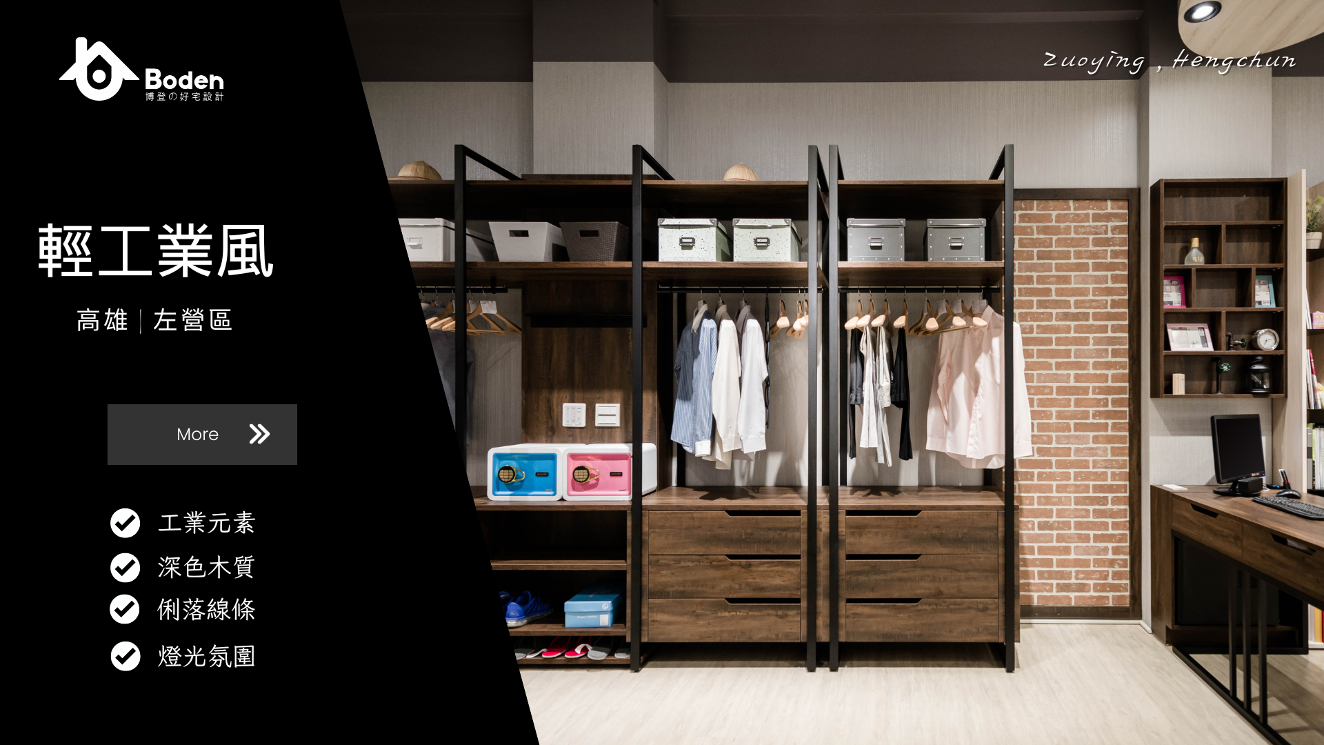 博登案例亮點: 在這個案例中,我們將紅磚牆與深色木質系統櫃結合,搭配黑色鐵件架構與軌道燈,