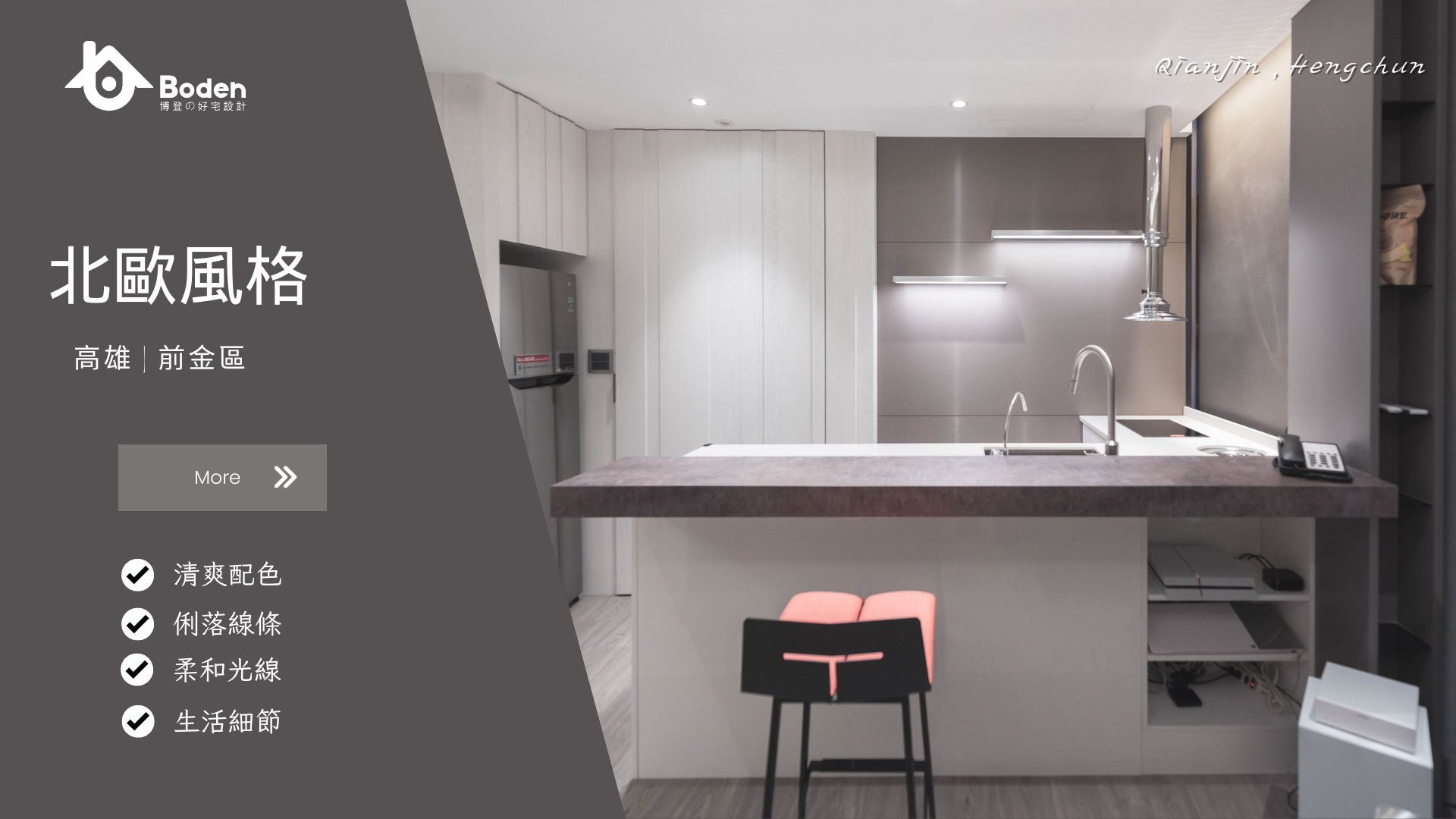 博登案例亮點: 在這個案例中,博登以灰白色調作為基底,搭配木質地板,展現北歐風的清新與自然,