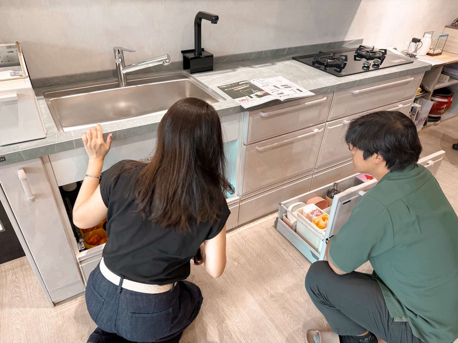 現場實際體驗琺瑯材質的收納櫃、好清的水槽,好推的抽屜~一邊解說、