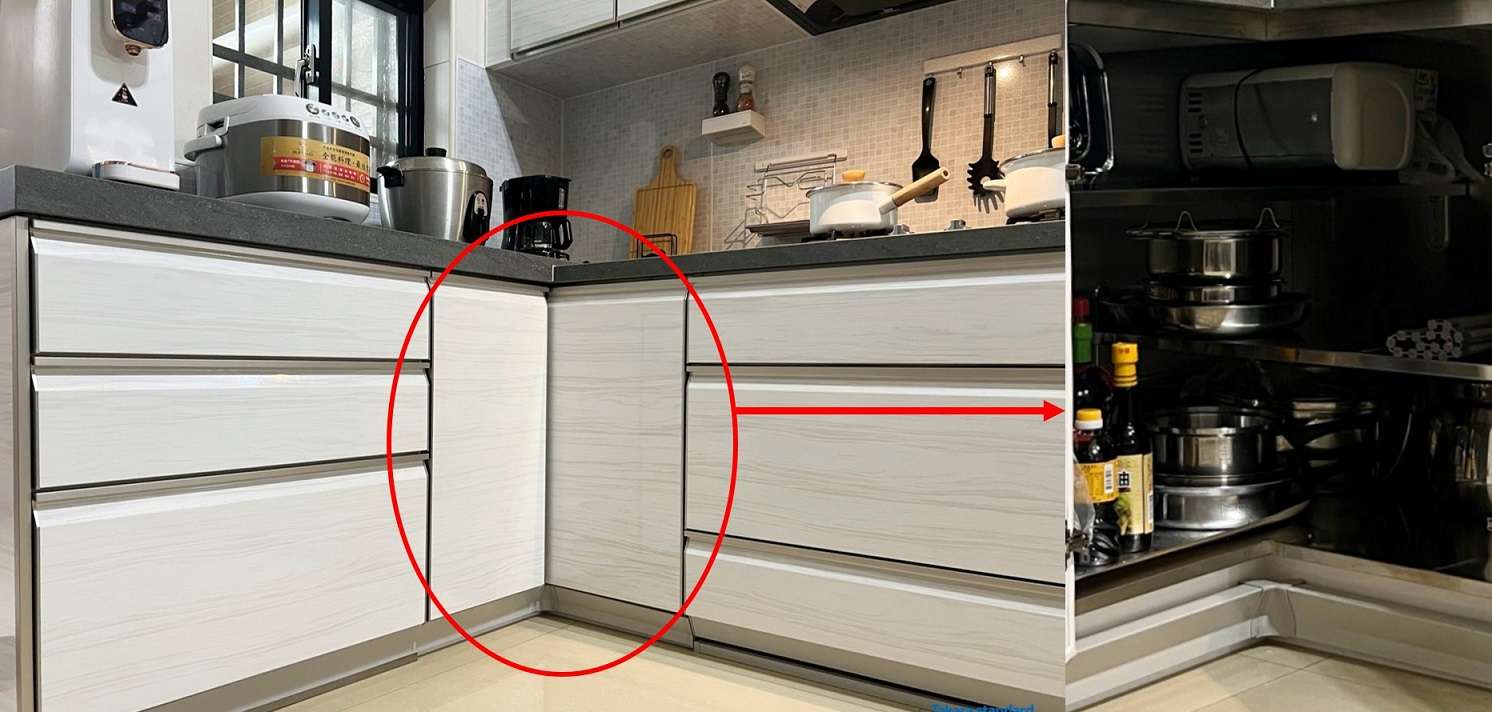 至於L型廚具,轉角處的死角,設計『對開門』讓空間充分利用,並建議採用TAKARA高階LEMURE收納櫃,使收納櫃使用空間極大化,